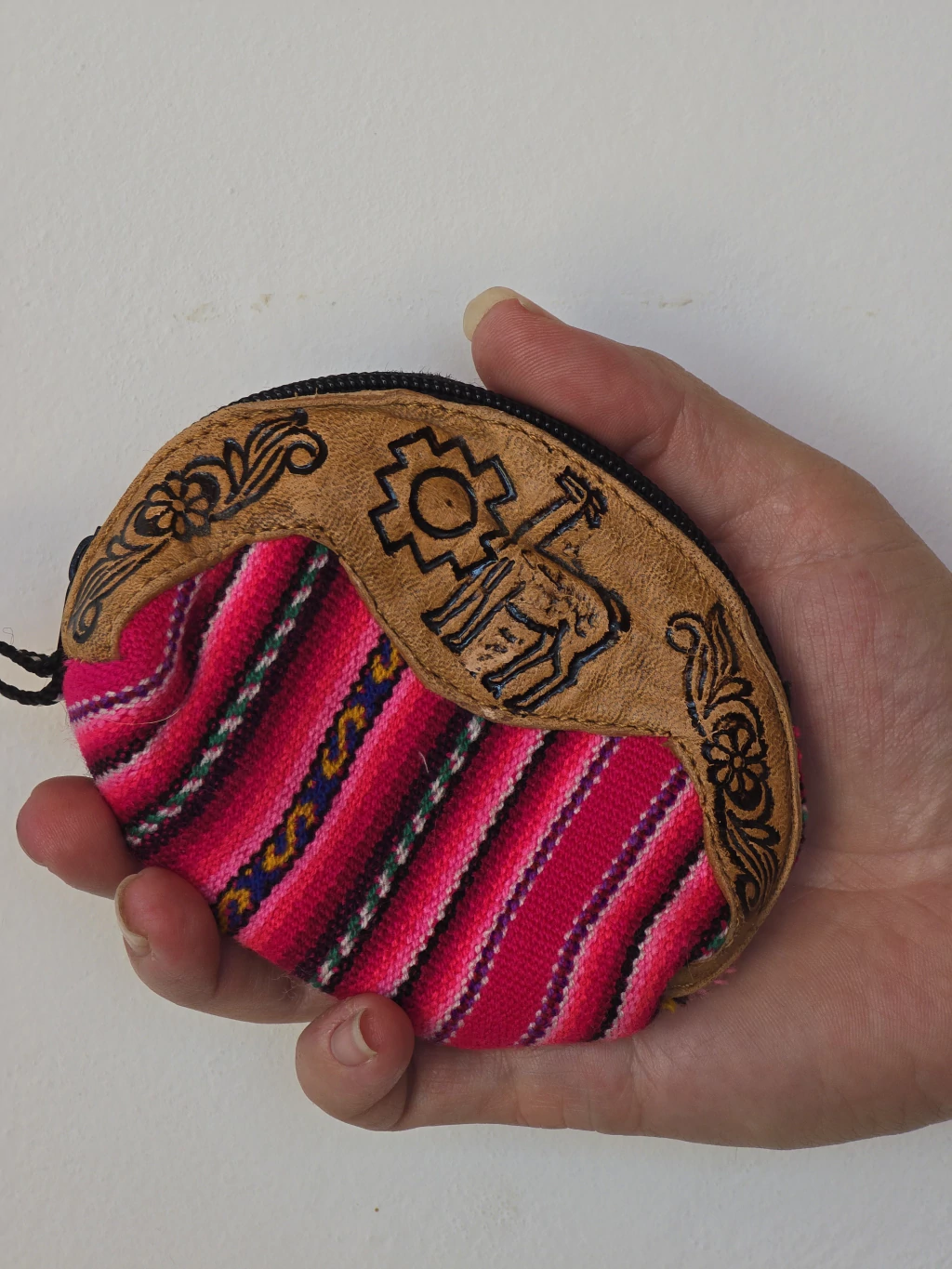 Este monedero combina la textura auténtica del aguayo con la resistencia y elegancia del cuero, forrado por dentro para proteger tus pertenencias. Sus dimensiones compactas de 10 cm de ancho por 9 cm de largo lo hacen ideal para llevar monedas, billetes y pequeños objetos con comodidad y estilo.