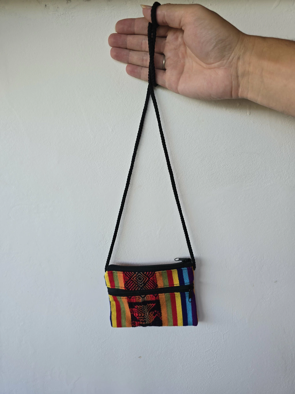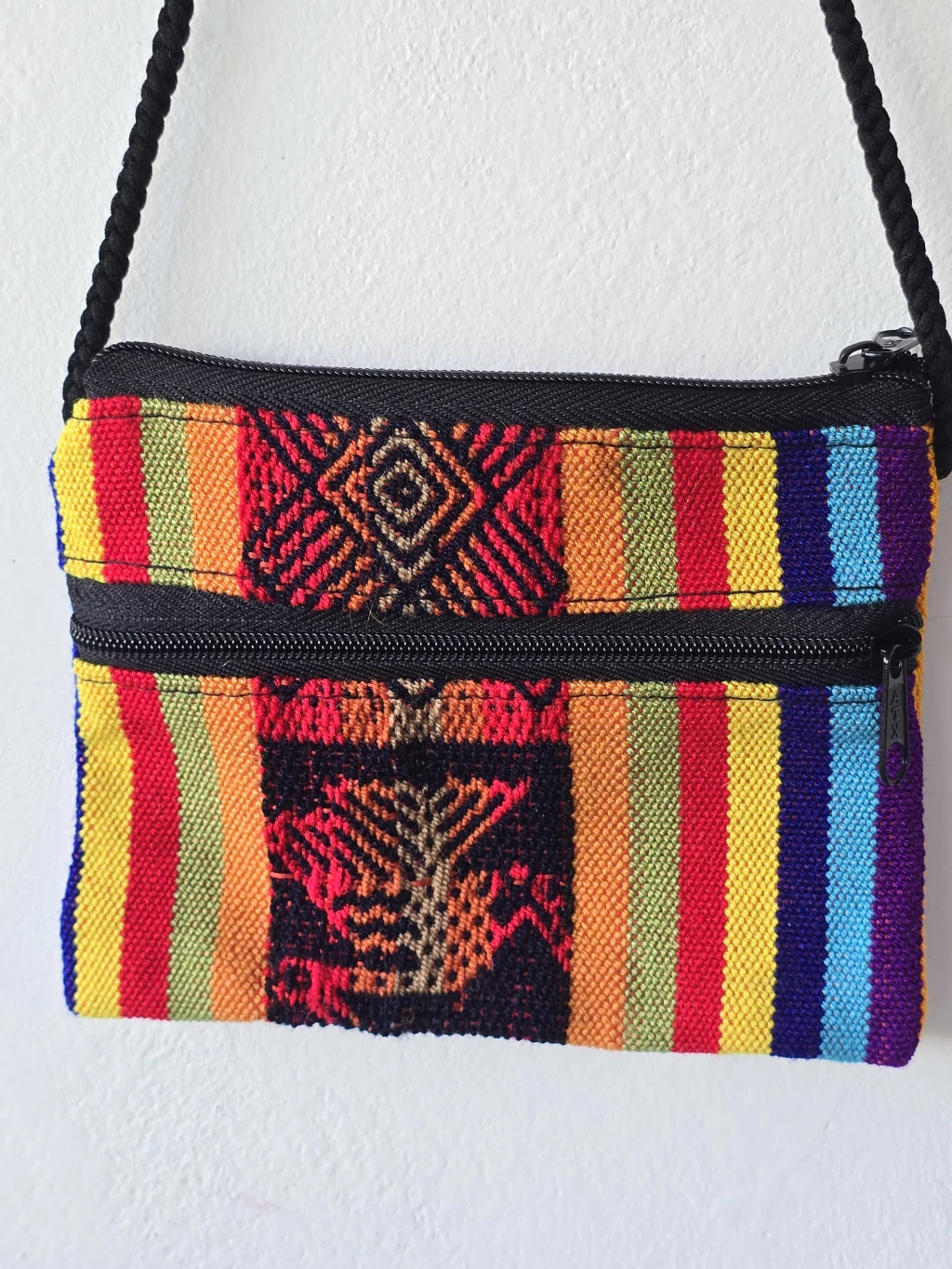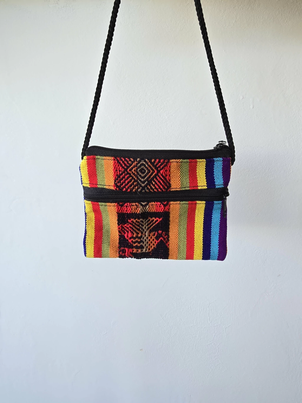 Confeccionado con auténtica tela de aguayo andino, cada pieza es un estallido de rayas de colores vibrantes y con un diseño central tejido que le añade un toque de arte tradicional. Su formato compacto esconde una funcionalidad sorprendente: