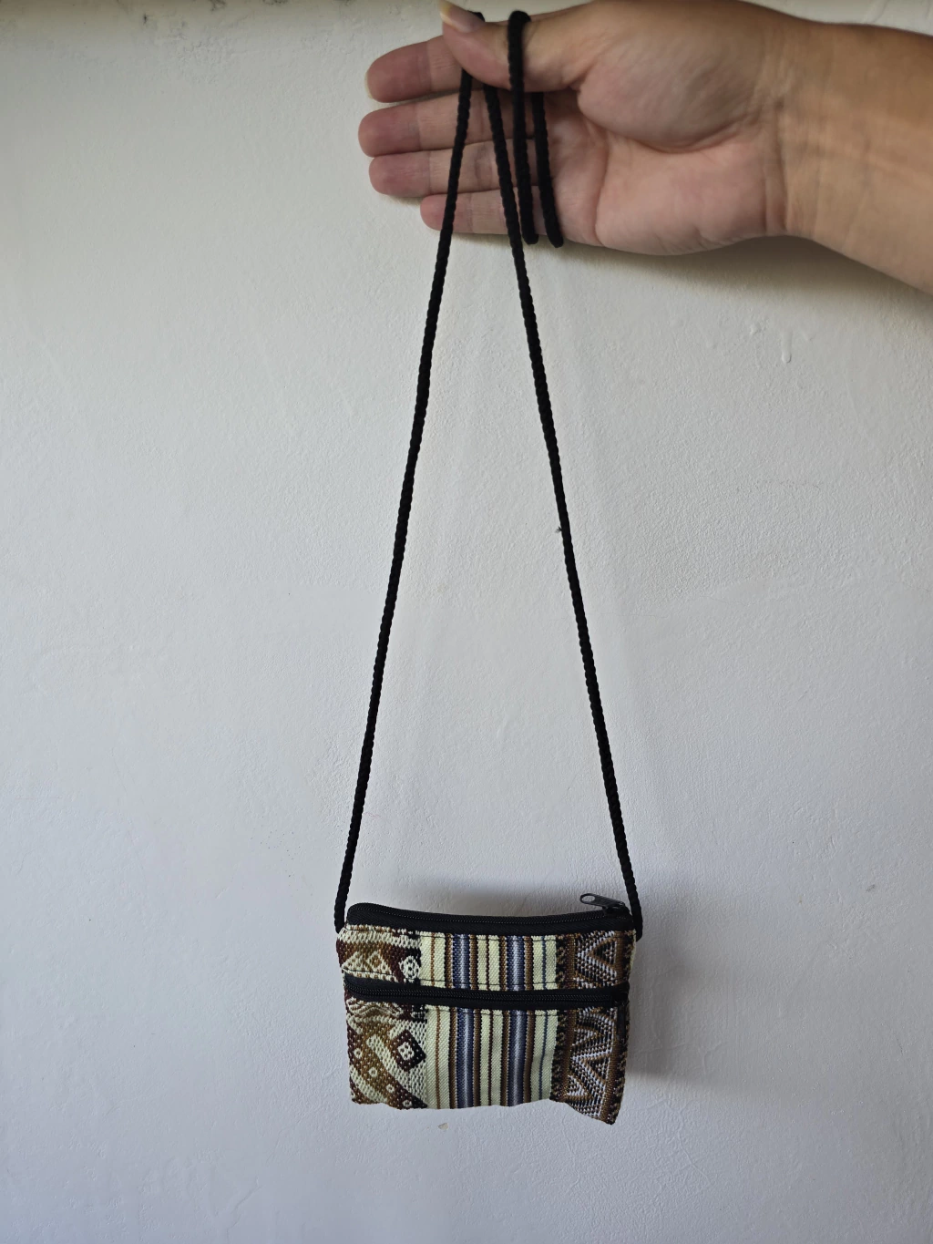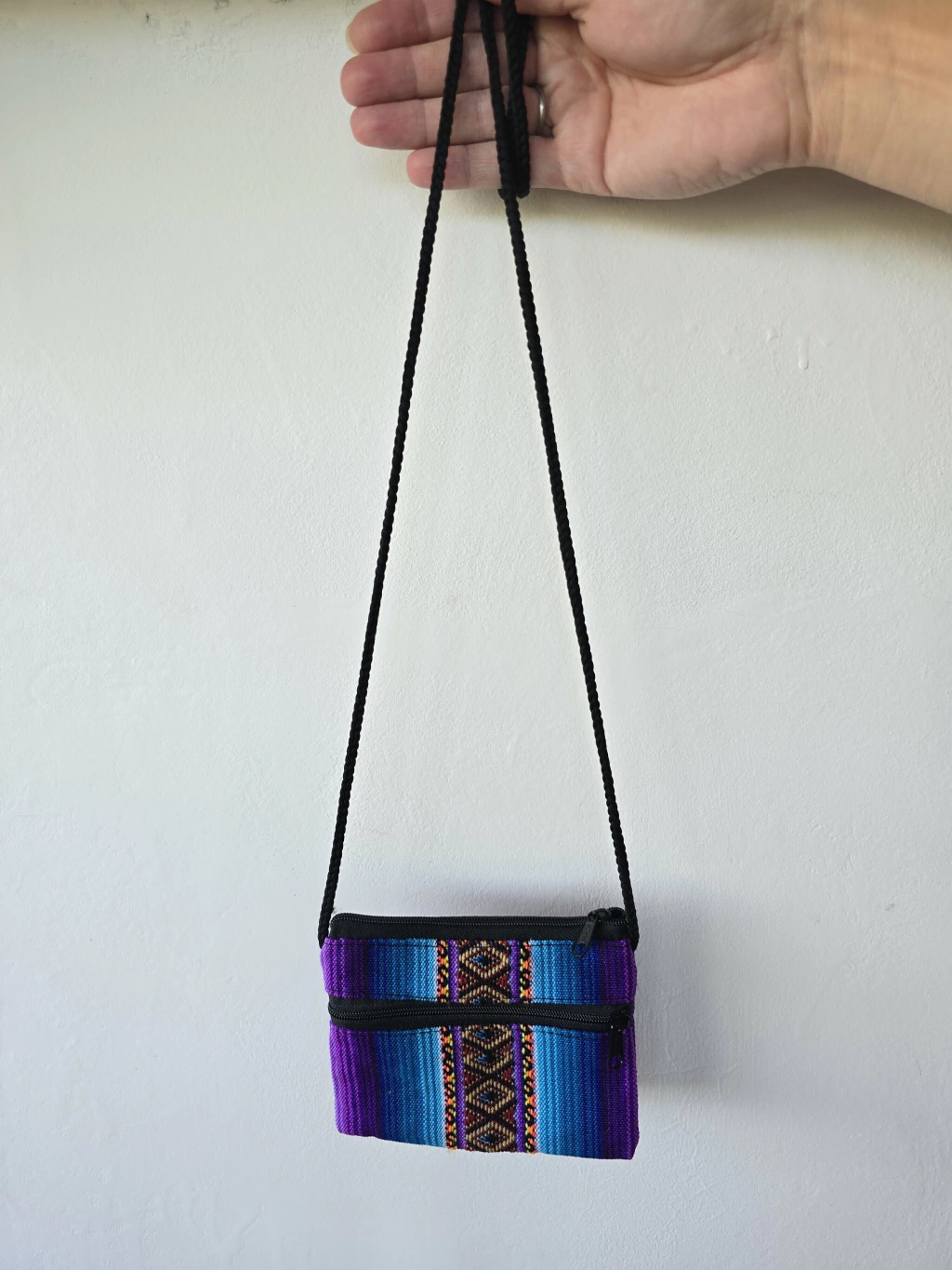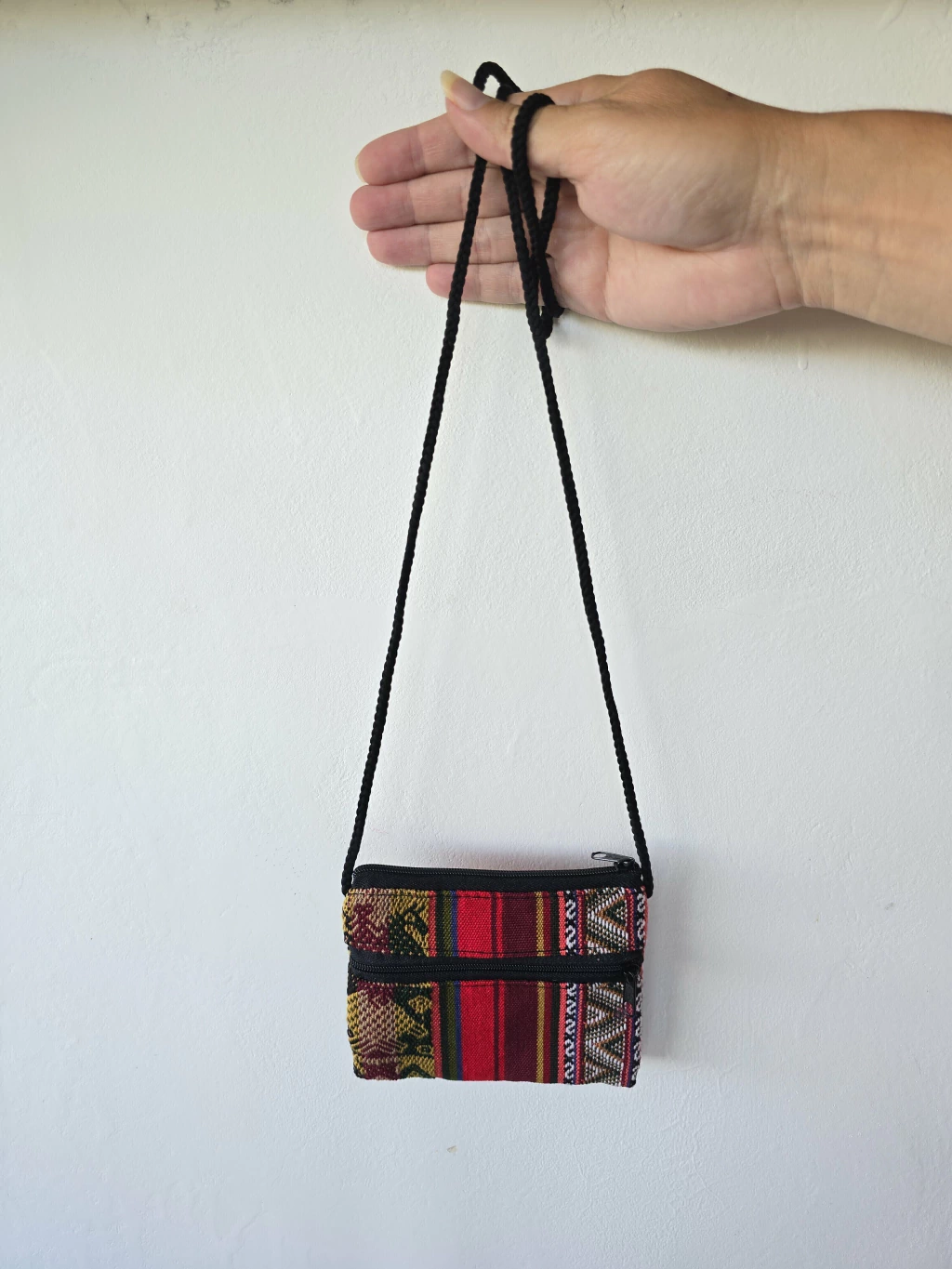 Confeccionado con auténtica tela de aguayo andino, cada pieza es un estallido de rayas de colores vibrantes y con un diseño central tejido que le añade un toque de arte tradicional. Su formato compacto esconde una funcionalidad sorprendente: